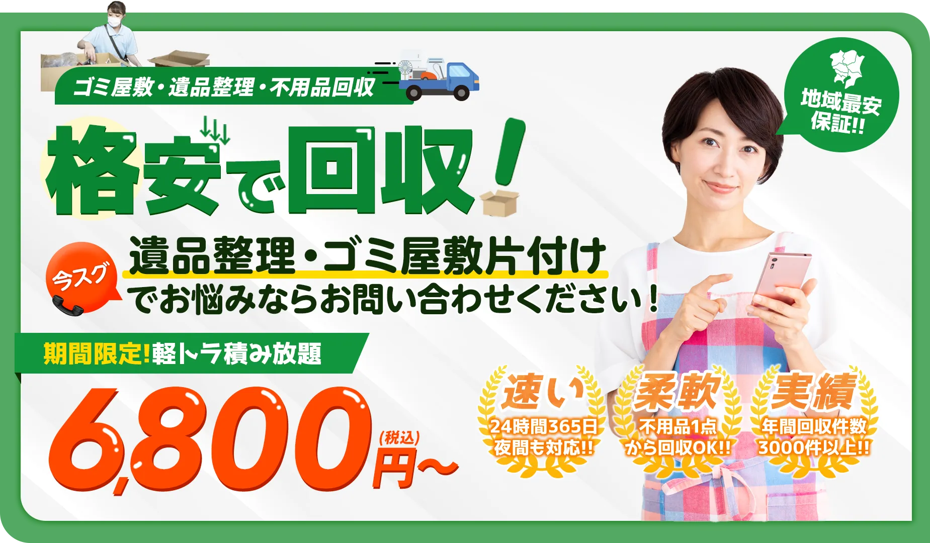 ゴミ屋敷、不用品回収だけでなく、大型ゴミや家財処分に関する豊富な経験と充実のサービスで全国のお客様から高い評価をいただいております。